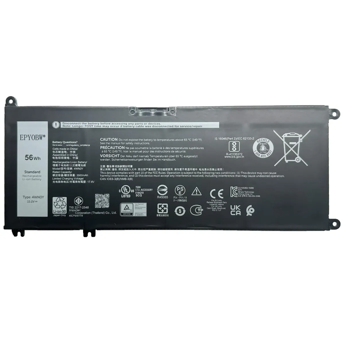 The Dell 4WN0Y is a 56Wh, 15.2V 4-cell Lithium-ion battery. It is a direct replacement for several Dell Inspiron 7000-series laptops and is often interchangeable with the 33YDH battery model...